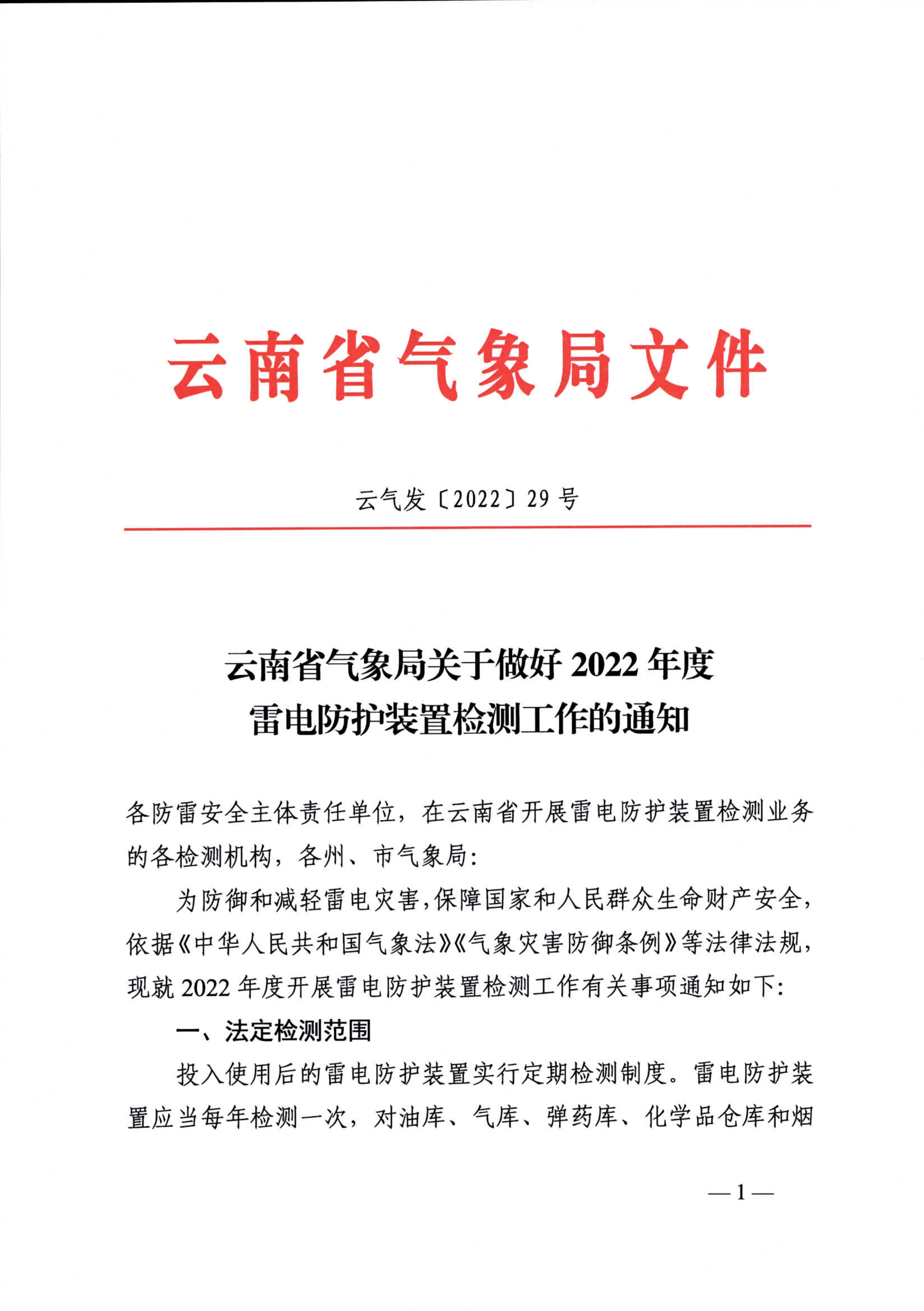 云南省氣象局關于做好2022年度雷電防護裝置檢測工作的通知