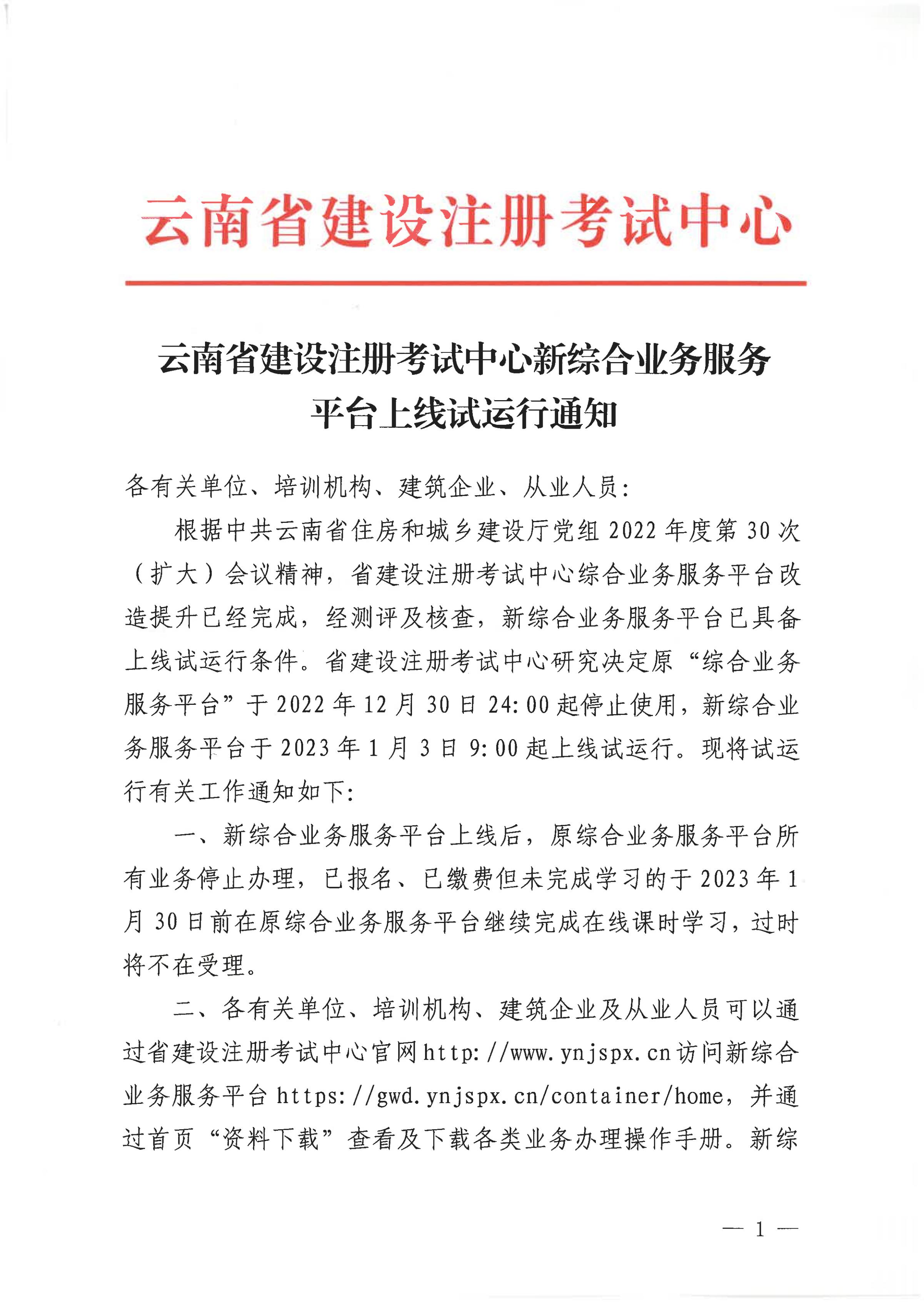 云南省建設注冊考試中心新綜合業務服務平臺上線試運行通知